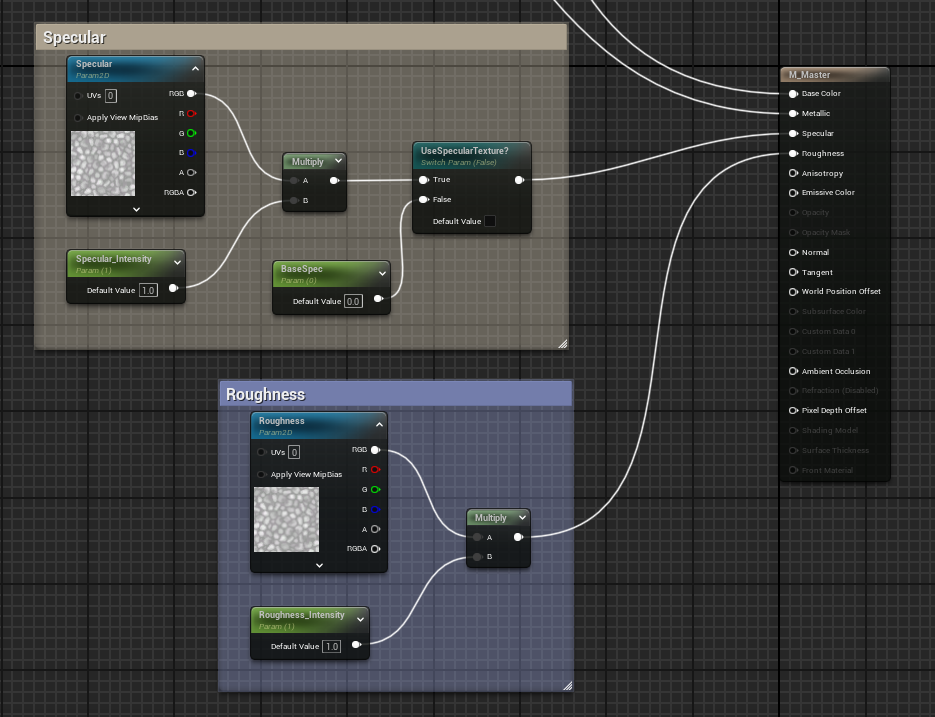 Specular와 Roughness 구현, Roughness의 경우 거의 모든 어셋이 해당 텍스처를 가지고 있기 때문에 Switch 노드를 생략하였다.