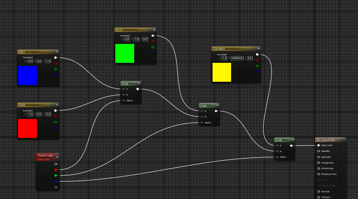 Vertex Color라는 노드를 활용하여 Vertex에 색을 입힐 수 있도록 input Data를 불러온다. Vertex Color를 Alpha값으로 사용하는 Lerp를 이용해서 최대 4가지 컬러를 입혀줄 수 있다.