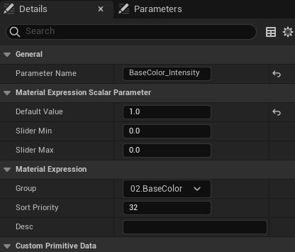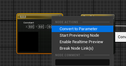 노드를 우클릭 - Convert to Parameter를 하면 Material Instance를 생성했을 때 값을 조절할 수 있는 옵션으로 노출시킬 수 있다.