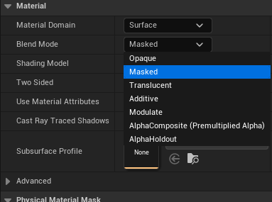 결과 노드 선택 - Details 패널 - Material - Shading Model을 Masked로 바꾸면 Opacity Mask를 사용할 수 있다.