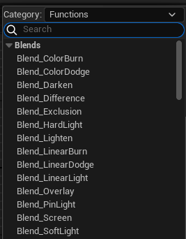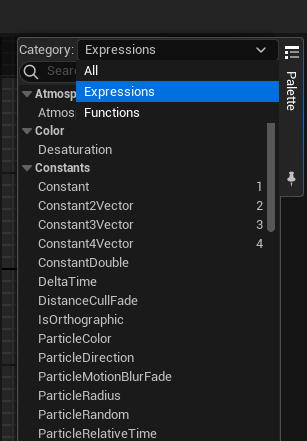Material Editor의 우측 상단을 보면 Palette가 있는데 Category 목록에서 Expressions(표현식)과 Functions(함수)를 모아 볼 수 있다. 또는 검색 가능