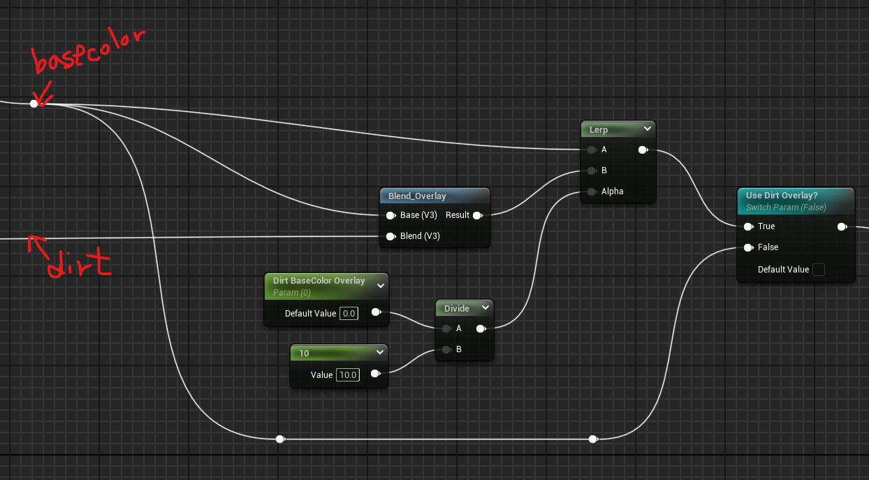 Use Dirt Overlay?라는 이름의 Switch노드를 2개 만들어 주어 BaseColor와 Roughness 연결에 각각 사용해준다.