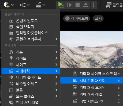 상단에 상자 + 모양 아이콘 - 시네마틱 - 시네 카메라 액터 추가