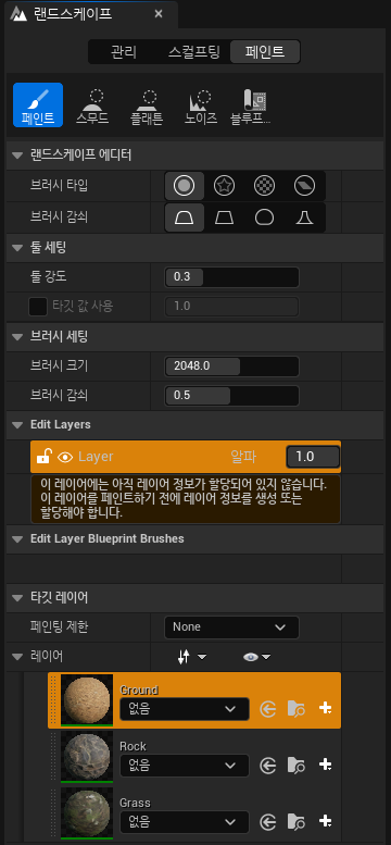 연결이 올바르게 됐다면 랜드스케이프 모드 - 페인트 탭 - 타겟레이어에 추가한 텍스처들이 나타남