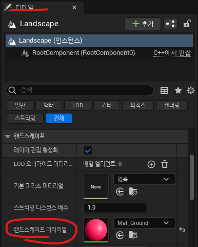 만든 메터리얼을 LandScape에 적용하기 위해서는 Landscape의 디테일 패널 - 랜드스케이프 - 랜드스케이프머티리얼에 적용하고 싶은 메터리얼을 삽입