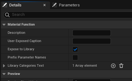 마지막으로 Material Function 에디터의 빈 곳을 클릭하면 Details패널에서 Expose to Library를 On해주면