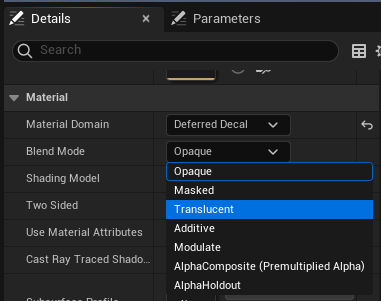 Material Editor - Details 패널에서 Material Domain은 Deferred Decal로 바꿔준다.