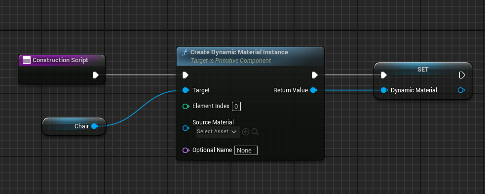 Construction Script 실행 핀을 Create Dynamic Material Instance 실행 핀에 꽂아준다.