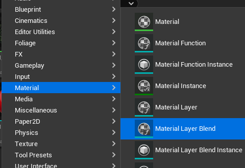 Contents Drawer에서 우클릭 - Material - Material Layer Blend를 만들 수 있다.