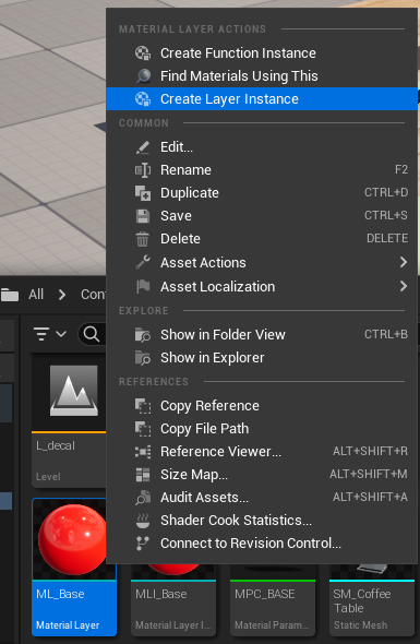 Material Layer Blend를 이용해 Alpha맵이 들어갈 수 있도록 해준 후, 우클릭 - Create Blend Instance를 해주면 Material Layer Blend에서 Parameter화 시켜주었던 옵션을 기반으로 응용할 수 있는 Instance가 생성된다.