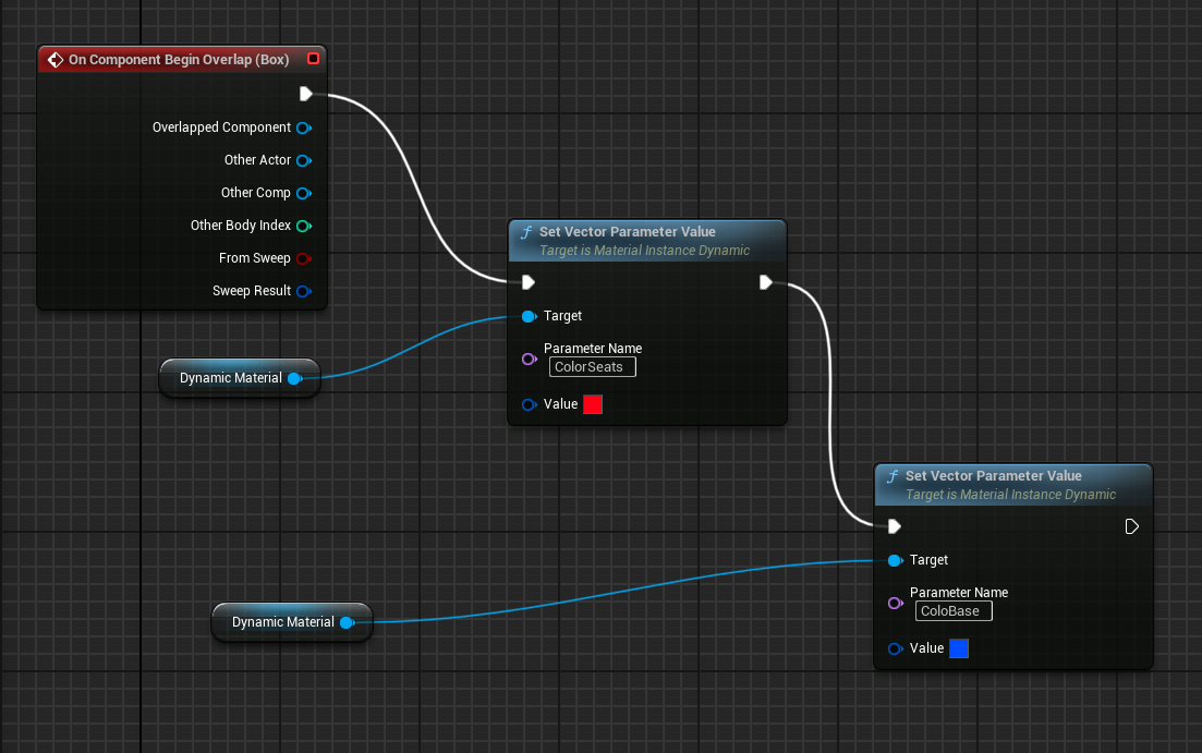 On Component Begine Overlap의 실행 핀을 Set Vector Parameter Value에 꽂아주고, 필요할 경우 한번 더 다른 Parameter 값에 대한 노드를 연결시켜준다. 다했으면 블루프린트 컴파일 + 저장.