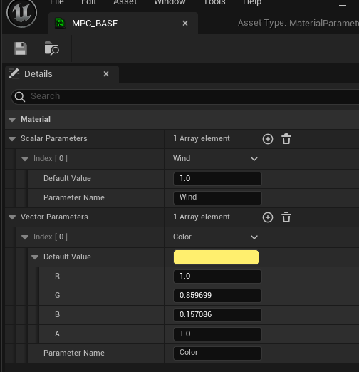 CollectionParameter의 Details패널에서 앞서 만든 MPC를 적용해줄 수 있고, MPC에서 생성한 변수 목록도 볼 수 있다.