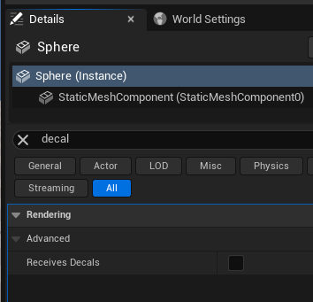 영향을 받지 않도록 설정하고 싶은 오브젝트의 Details 패널 - Recives Decals를 off해주면 Decal에 영향을 받지 않는다.