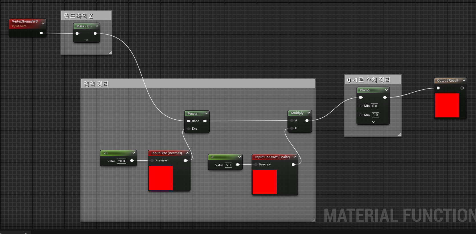 마지막으로 WS가 붙은 노드를 작업하다보면 수치값이 어마 무시하기 때문에 원하는 수치 범위로 정리해주는 것이 중요하다. Clamp를 달아 0~1값으로 수치를 조절해준다.