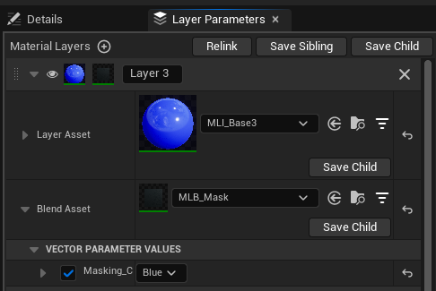 다시 Material Instance로 가서 Layer Parameters 패널을 들어간 후 각 레이어의 Blend Asset이라고 써있는 곳에 위에서 만든 MLB를 넣어주면 앞서 달았던 ChannelMaskParameter가 나타나며 채널별 알파맵을 적용할 수 있게된다.