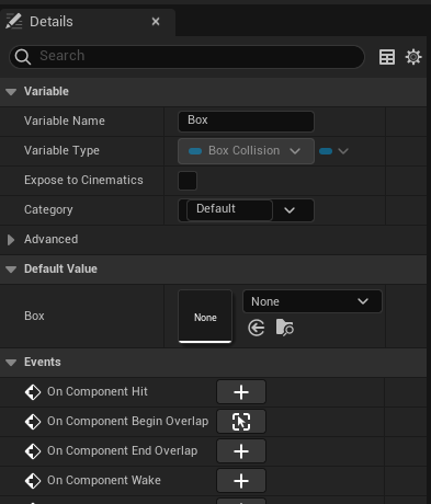 여기서 Box를 클릭하여 Details 패널에서 Events- On Component Begine Overlap을 생성해준다.