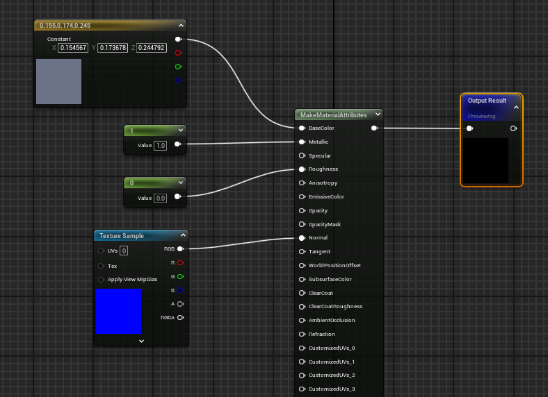 Material Function을 만들어주고 Material 형태로 만들어 주기 위해서 Make Material Attributes 노드를 생성해서 연결해주어야한다. (Material Function은 기본적으로 Material을 만들기 위한 Input Pin이 제공되지 않는다)