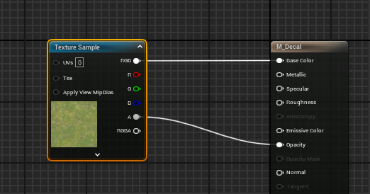 간단한 연결 테스트, 텍스처의 컬러와 알파를 각각 연결하고 저장한 후 만든 Material을 Decal Actor의 Details 패널 - Decal Material 부분에 넣어준다. ( 또는 Material Instance화 시켜준 후 적용해준다. 네이밍 규칙 MI_이름)