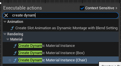 검색창에서 'Create Dynamic Material Instance(앞서 불러온 Static Mesh의 이름)' 노드를 불러와준다.