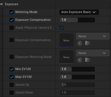 Metering Mode를 Basic으로 뒤고 Min/Max EV100를 1로 두면 뷰포트 설정에서 EV100을 1로 맞춰놓은것과 같이 표현된다. 렌더링 시 나타나는 효과이다.