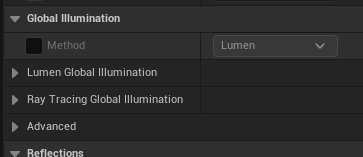 Lumen 또는 Ray tracing의 GI를 조절해줄 수 있는데, 사용하려면 프로젝트 세팅에서 Lumen 또는 Ray Tracing으로 설정해야 작동한다. (체크는 될 수 있으나, 실제 효과는 프로젝트 세팅이 된 상태여야 작동한다)