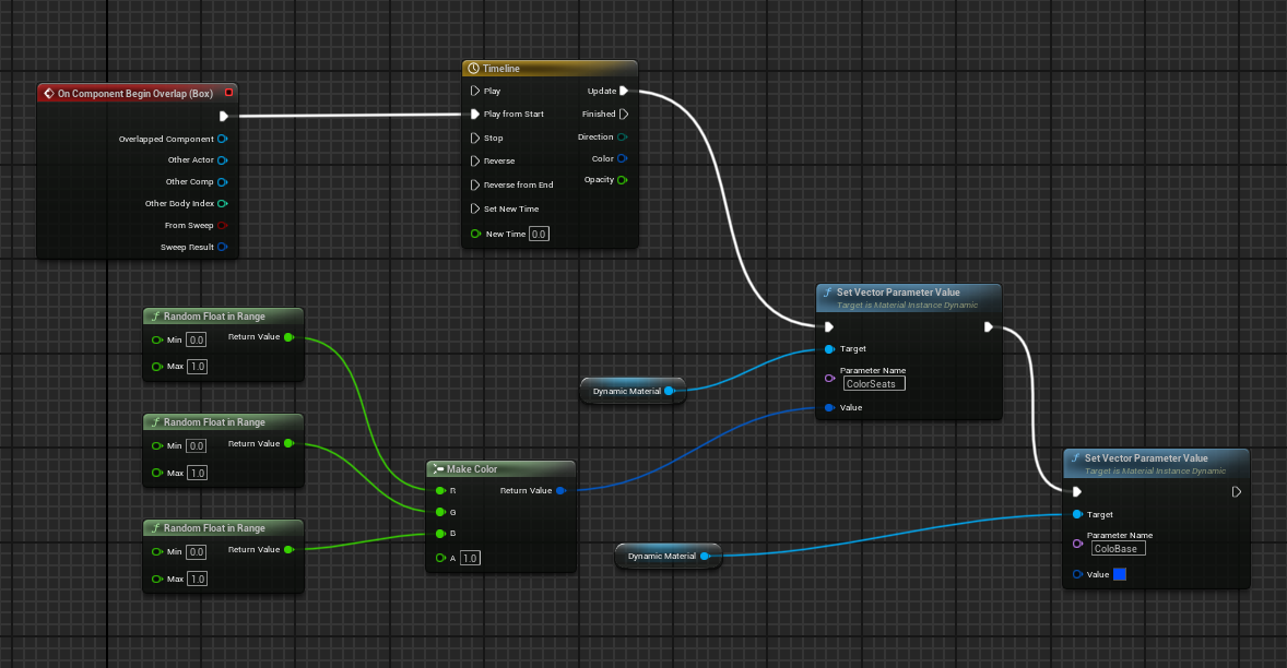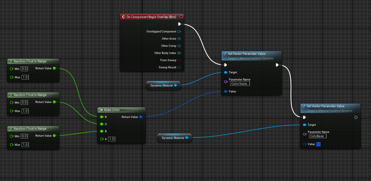 Set Vector Parameter Value에서 Value 인풋핀에 Make color 노드를 연결하고 각 RGB채널에 Random Float in Range 노드를 연결해준다. Min은 0 / Max 는 1.