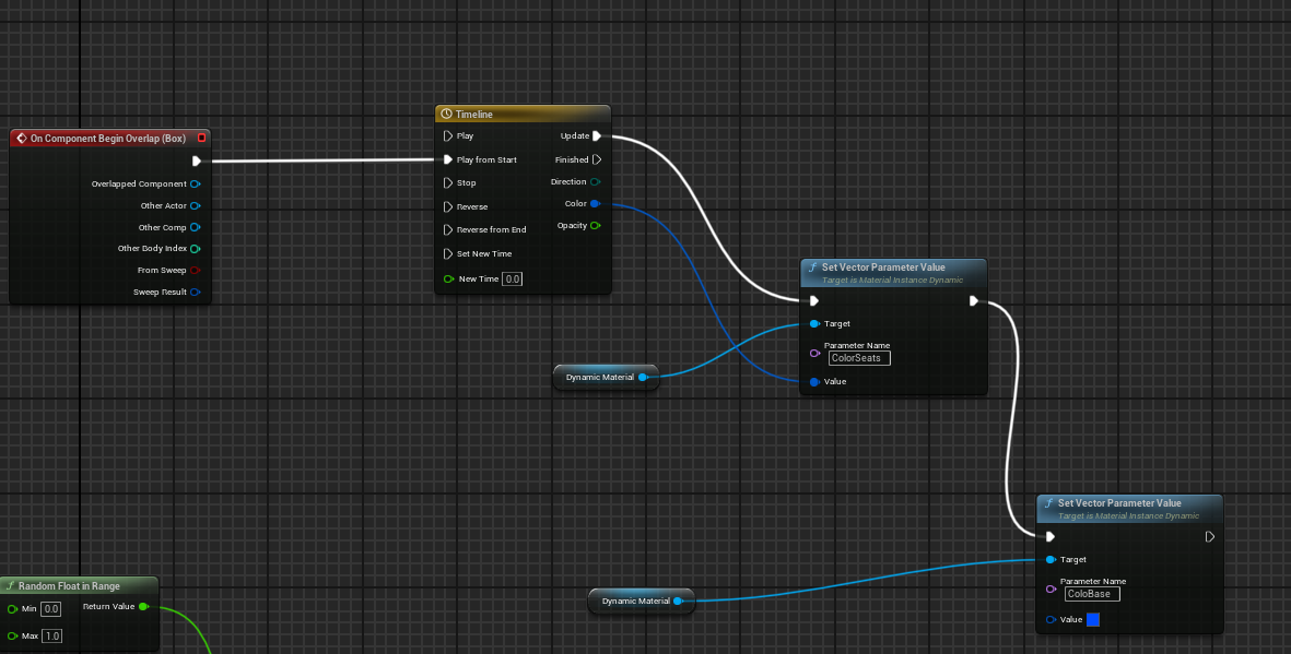 다시 이벤트 그래프로 돌아와서 on component begin overlap 실행핀을 TimeLime의 Play from start에 연결하고 update로 나오는 출력 핀을 set vector parameter value의 실행핀에 연결해준다.