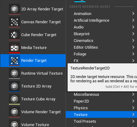 Texture에서 Render Target 텍스처를 생성하고, Scene Capture 2d 액터의 디테일 패널에서 Texture Target에 생성한 Render Target을 넣어준다. Render Target Texture란 실시간으로 캡처한 것을 텍스처로 만들어주는 어셋이다.