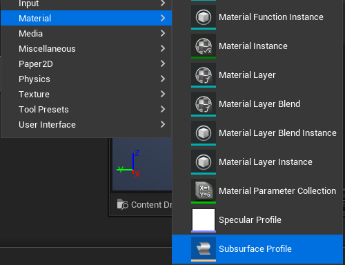또한 Content Drawer에서 우클릭하여 Subsurface Profile을 추가적으로 만들어준다.