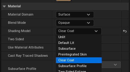 디테일 패널에서 Shading Model을 Clear Coat로 바꿔준다.
