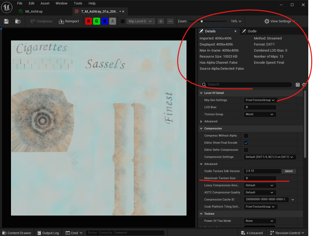 Compression메뉴에서 Maximun Texture Size를 조절하면 사이즈를 바꿔줄 수 있다. 0은 Imported된 상태의 사이즈를 쓰겠다는 의미. 저장하기.