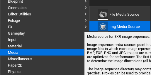시퀀스 이미지를 소스로 사용하려면 Content Drawer 우클릭 - Media - Img Media Source 생성( 단일 파일일 경우 File Media Source도 많이 사용)