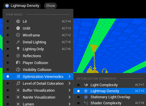 라이트맵을 확인하는 방법 : View mode에서 Optimization Viewmodes - Lightmap Density를 확인한다.