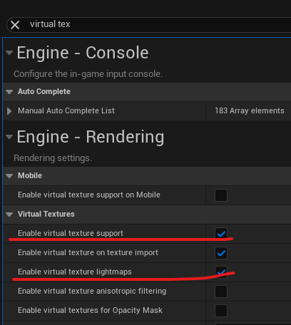 * UDIM 사용을 원하면 Project Setting에서 Enable Virtual Texture Support랑 Enable Virtual Texture Lightmaps를 체크해준다.