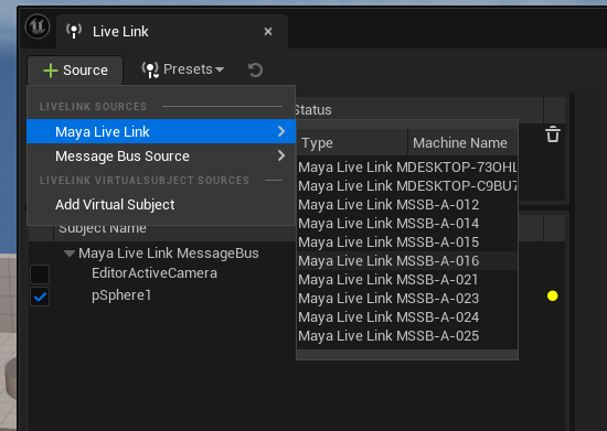 +Source - Maya Live Link에서 본인 컴퓨터 선택하면 마야에서 Connected 표시로 바뀌고 마야에서 작업 중인 어셋이 뜬다.