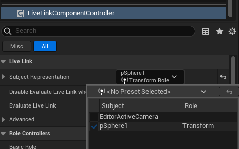 Live link Controller 선택 후 Subject Representation에서 연결해놓은 Maya Live Link를 선택해준다.