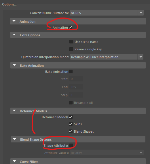 Export 시 옵션 주의 사항 : Animation이랑 블랜드쉐입있다면 Shape Attributes 등 체크해주기
