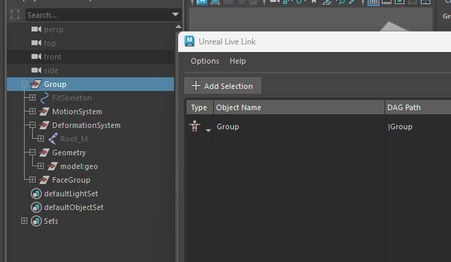 *리깅된 파일을 마야에서 LiveLink로 연결해줄 때는 지오메트리와 리깅 시스템을 모두 포함한 최상단 그룹을 마야에서 추가해주어야한다.