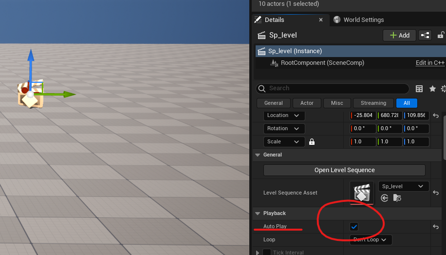 시퀀스에 key 조정을 마치고 시퀀스를 레벨에 배치 후 디테일 패널에서 Auto Play를 체크해주면 Play 시 자동으로 재생되게 된다. Loop 설정도 가능.