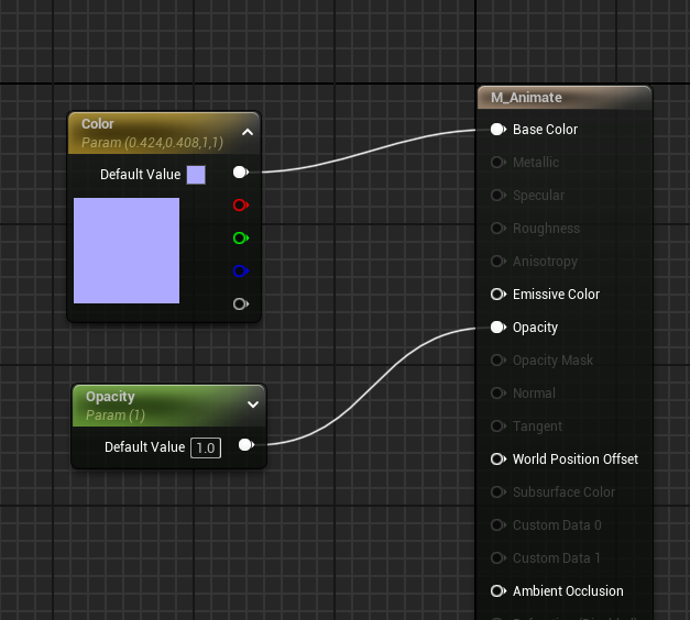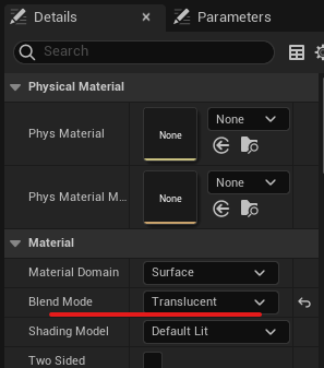 머티리얼 생성 후 Blend Mode를 Translucent로 변경 후 기본 컬러, 오파시티 파라미터를 달아준다.