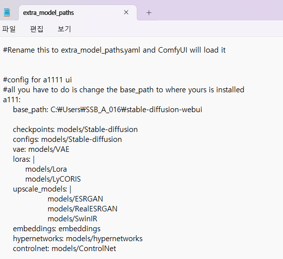파일명의 .example을 지워주어야한다. ( extra_model_paths.yaml 로 만들기 )