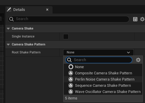 블루프린트를 열면 우측 디테일 패널에서 Root Shake Pattern을 선택해 줄 수 있다.
