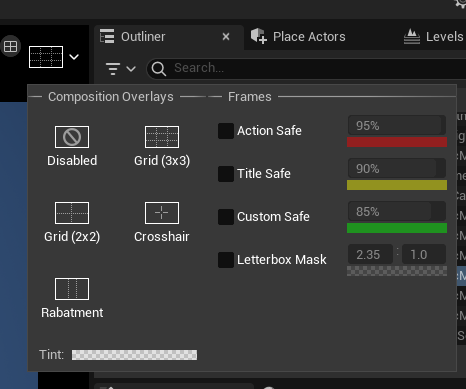 시네마틱 모드로 뷰포트를 변경하면 뷰포트 우측 상단에 가이드를 킬 수 있는 아이콘이 생긴다.