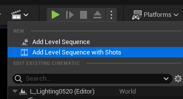 기존의 작업 레벨 시퀀스들을 샷으로 편집하기 위해서 Add Level Sequence with Shots를 추가해주고,
