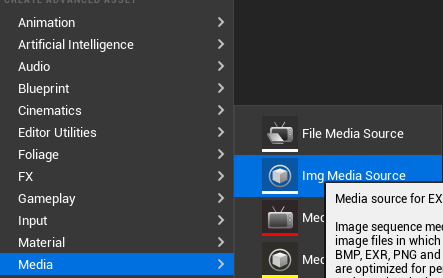 이미지 시퀀스를 불러오기위해 Content Drawer에서 우클릭 - Media - Img Media Source 생성