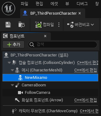 언리얼엔진 기본 제공 3인칭 게임 모드의 캐릭터를 리타겟팅을 마친 새로운 캐릭터로 변경해보기.