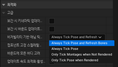 최종적으로 기존에 있던 캐릭터의 visibility를 해제해주고, 최적화 - 고급 - 비저빌리티 기반 애님 틱 옵션을