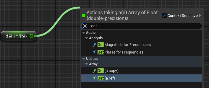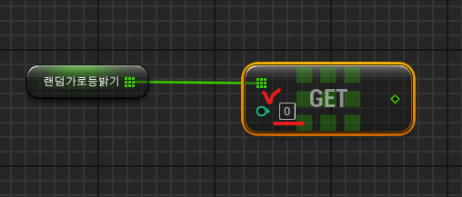 인덱스 목록이 세팅된 랜덤 가로등밝기 변수를 Get으로 가져와주고 핀을 빼서 Get(a ref)를 연결해준다.