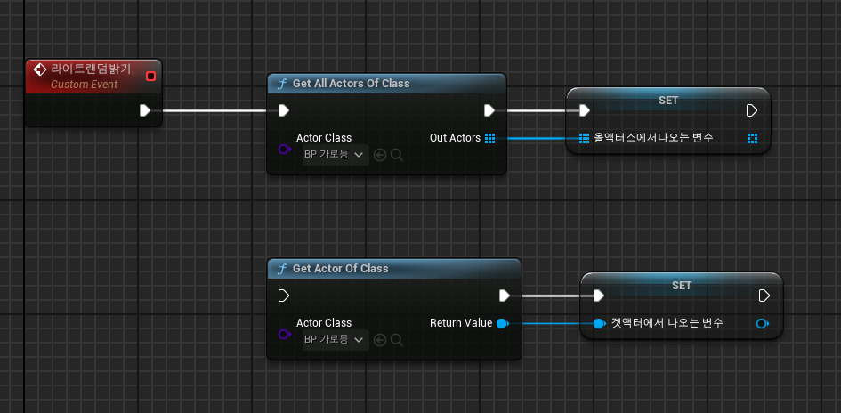 '가로등밝기조절'과 '1길가로등밝기조절' 이벤트를 생성하고 이번에는 Get All Actors of Class with Tag를 연결해준다.