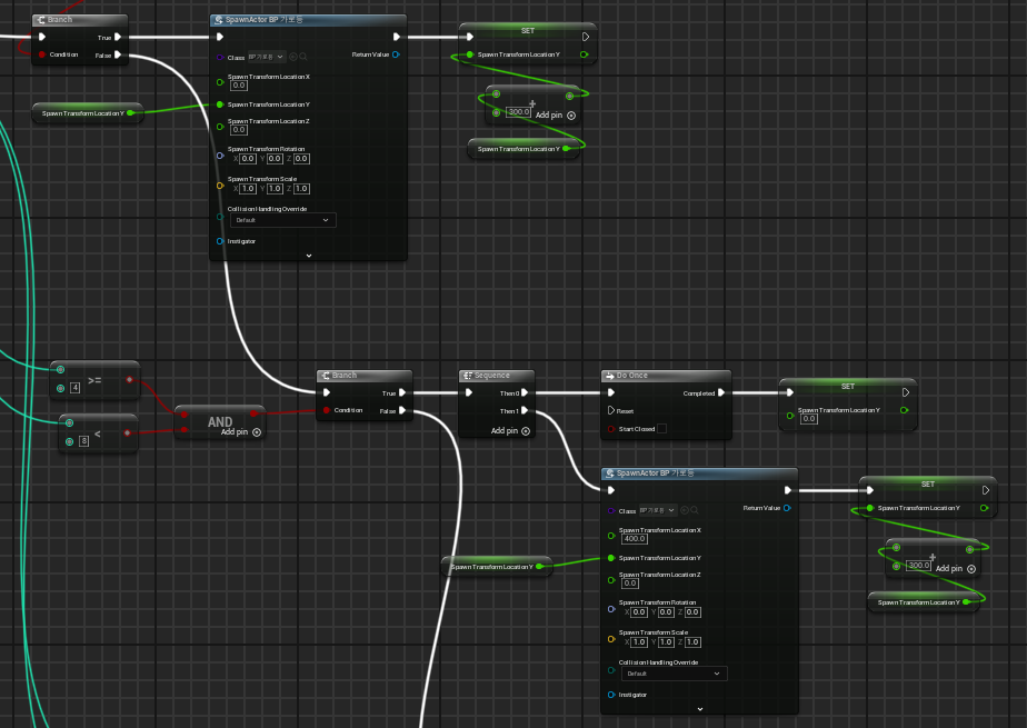 해당 Spawn Actor from class노드를 원하는만큼 반복하기 위해서는 For Loop 노드를 연결해줄 수 있다.